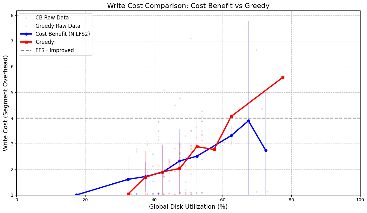 Because timestamp and greedy are approximately the same policy within the frame of hot/cold access, we only evaluated the write cost of greedy and cost-benefit. In Figure 8 NILFS2 write cost increases as utilization surpasses 60% for both greedy and cost-benefit similar to Sprite LFS. NILFS2 also surpasss FFS at lower-utilization for writes highlighting a primary strength of NILFS2: small writes and small-file creation. However, cost-benefit and greedy perform around the same in terms of write cost.