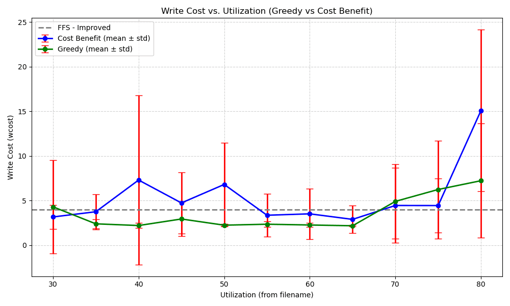The modified workload writes repeatedly at a fixed disk capacity using pre-written hot/cold access and runs the cleaner daemon once every 500 writes. The cleaner was modified to clean a maximum of 40 out of 64 available segments. Figure 9 indicates that with this workload cost benefit is shown to have a lower write cost than greedy. The modified workload does not determine write cost with the same precision as the original workload. It instead estimates write cost using: Where and is the number of segments that are actually cleaned. It is actually simple to record instead of estimating it but due to time constraints, we were unable to modify the cleaner daemon to record and aggregate the average which would take a significant refactor.
